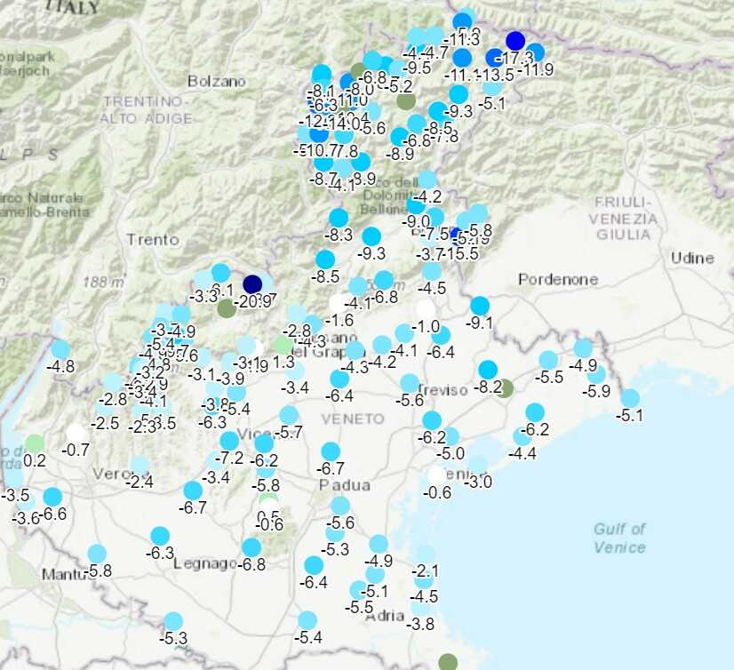 Un risveglio da “battere i denti” questa mattina, per gli abitanti del Veneto, in particolare della provincia di Treviso, con temperature minime comprese tra -6 e -9°C come hanno rilevato le centraline Arpav di Ponte di Piave (-8,4°) e Gaiarine (-9,1°).