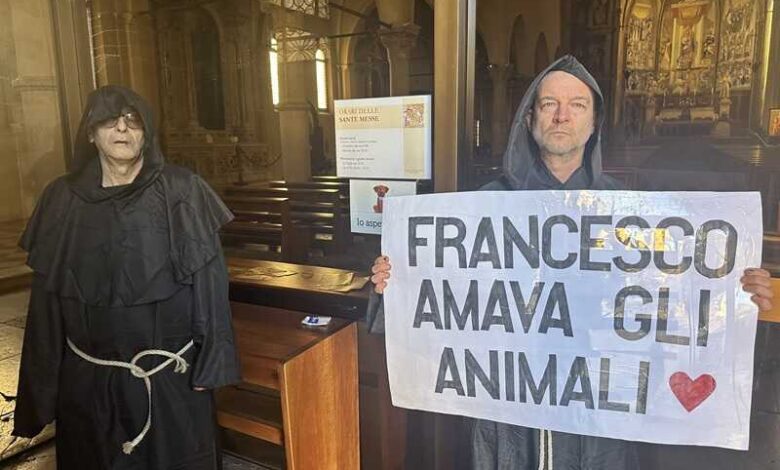 Per contestare il divieto d’ingresso ai Cani affisso sulla porta del duomo di Sacile, i militanti di 100%Animalisti hanno effettuato, nel pomeriggio di venerdì un blitz simbolico travestendosi da frati Francescani ed hanno esposto un cartello con scritto: “Francesco amava gli Animali”.