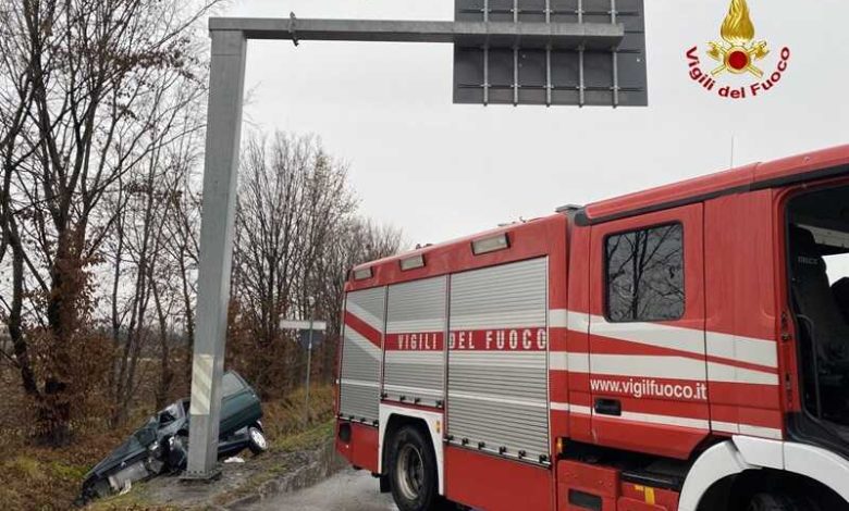 La vettura è finita autonomamente fuoristrada ed ha terminato la corsa contro un portale della segnaletica e adagiandosi nel canale di scolo.