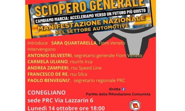 La crisi dell’automotive incombe sull’Italia, e i lavoratori trevigiani non stanno a guardare. Le scelte di ridurre la produzione e la mancanza di interventi istituzionali hanno spinto i sindacati a proclamare lo sciopero generale del 18 ottobre. In vista dello sciopero generale dell’automotive del 18 ottobre, Rifondazione Comunista organizza a livello regionale un incontro in cui si discuteranno le ragioni e le richieste dei lavoratori per un futuro più sicuro ed equo. L’appuntamento è fissato per lunedì 14 ottobre alle ore 18:00 presso la sede provinciale del Partito in via Lazzarin 6 a Conegliano.