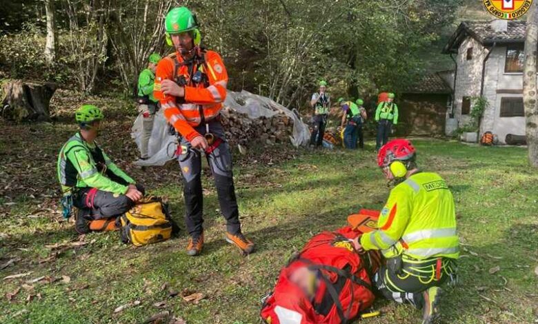 Stabilizzato e caricato in barella, il ferito è stato sollevato e trasportato sullo spiazzo di una baita, da dove è stato issato a bordo.