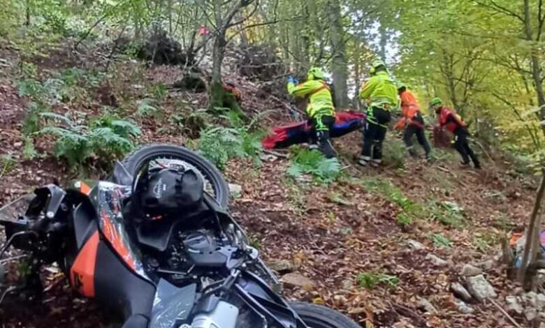 Il centauro era caduto per una trentina di metri, riportando un sospetto trauma alla gamba.
