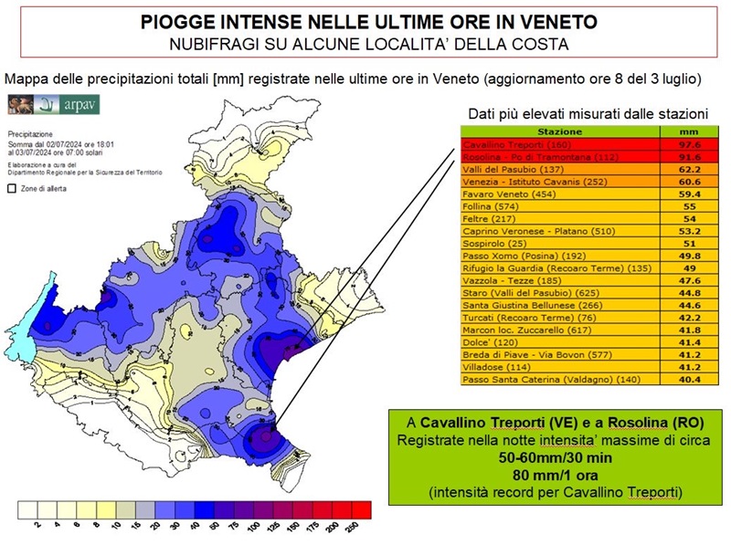 Dopo l’ennesimo periodo di tempo perturbato relativo a quest’ultima settimana, in particolare la tarda serata del 2 luglio quando si sono registrate forti piogge su alcune zone del Veneto, sulla costa si sono misurate nelle prime ore della notte del 3 luglio intensità a carattere di nubifragio: vedi Cavallino Treporti 97mm e Rosolina 91mm.