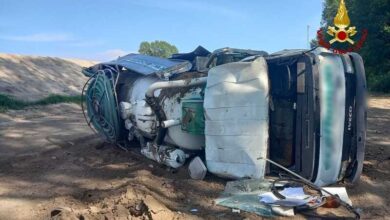 San Donà: scoppia uno pneumatico e autobotte si rovescia nella golena