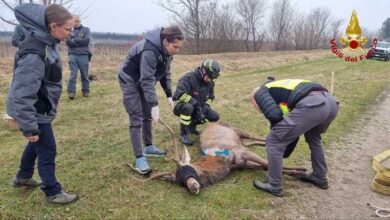 Difficili operazioni di recupero di un cervo nelle campagne di Roveredo in Piano