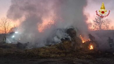 Fontanafredda: cumulo di rotoballe a fuoco