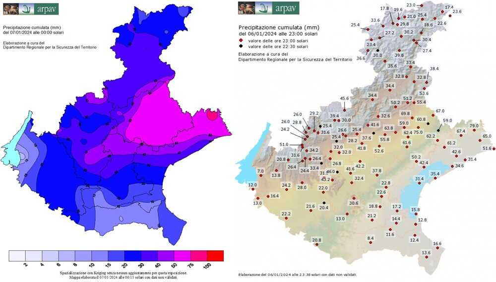 Solo nella giornata odierna sono caduti mediamente 60/80 mm di pioggia. In foto le cartine del Veneto emanate dall’Arpav in cui si riconosce distintamente l’area in cui ci sono state maggiori precipitazioni tra cui spiccano Vazzola con 75mm e Fossalta di Portogruaro con 79mm., seguono Conegliano con 70 mm e Gaiarine 67. I corsi d’acqua si sono tutti ingrossati ma non ci sono state criticità grazie anche ai bacini di laminazione.