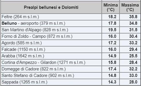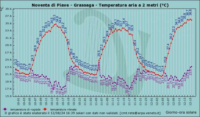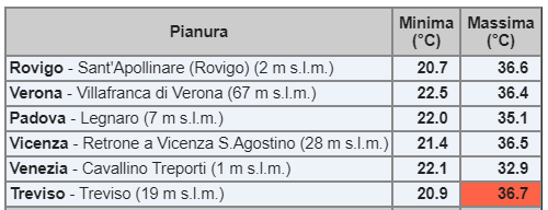 Ma la centralina dell’Arpav che ha registrato il valore più alto (36,8° C.) è quella posizionata a Grassaga in comune di Noventa di Piave.