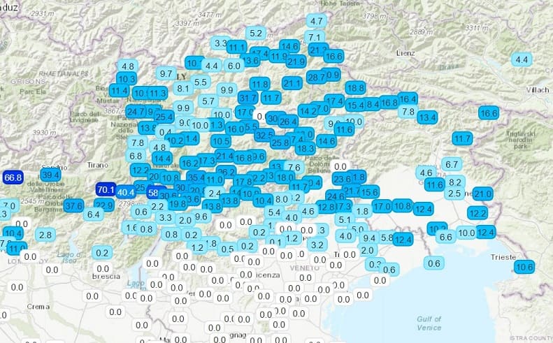 I maggiori quantitativi si sono avuti sulle Dolomiti, ad Arabba e Malga Ciapela, come testimoniano le centraline dell’Arpav, e quasi 40 mm a Col Indes, in Alpago. In pianura, 12 mm a Gorgo al Monticano e Portogruaro.