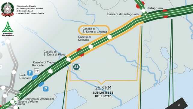 Una tappa fondamentale in un percorso che cambierà nei prossimi anni la logistica e la mobilità dell’intero Nordest; un’opera che avrà ricadute enormi per le aree produttive del Friuli-Venezia Giulia e del Veneto e, in termini di qualità e sicurezza stradale, per famiglie, pendolari e turisti. Il bando per la progettazione esecutiva e la costruzione dell’ampliamento con la terza corsia della A4 (Venezia – Trieste), nel tratto di 25 chilometri tra Portogruaro e San Donà di Piave, è stato aggiudicato al Consorzio Stabile Eteria (Vianini Lavori S.p.a, Itinera S.p.a e I.Co.P S.p.a).