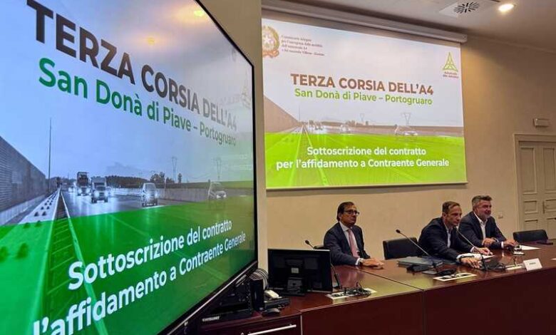Siglato a Trieste il contratto per l’affidamento dell’intervento da 870 milioni di euro per realizzare la terza corsia tra Portogruaro e San Donà di Piave.