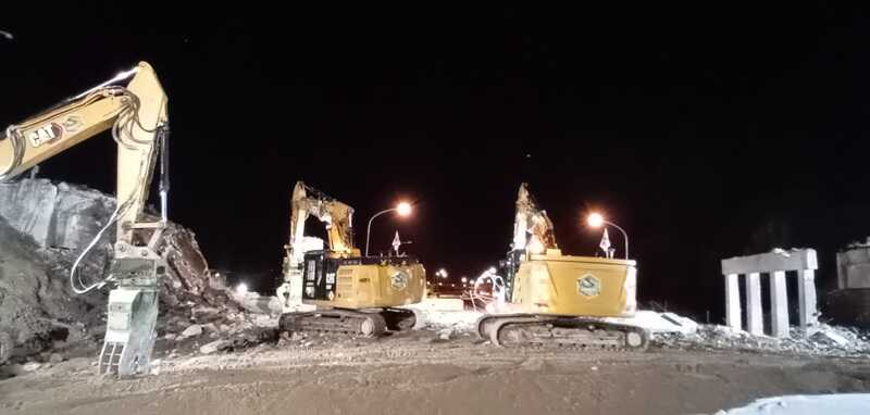 Tutte operazioni propedeutiche e necessarie per l’entrata in azione degli escavatori che, dotati di cesoie e martelli, hanno operato nell’area a partire dalle ore 21,30. Con l’intervento di nebulizzatori si è anche impedito lo spargimento delle polveri nell’aria, determinate dalle demolizioni. Alle 23,00 il manufatto era stato demolito.