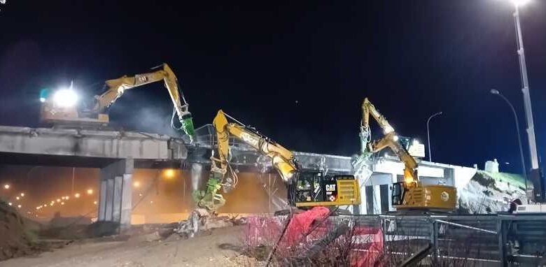 Prima l’abbattimento della campata centrale in 45 minuti, poi nello stesso lasso di tempo anche le spalle del manufatto sono cadute sotto i colpi degli escavatori.