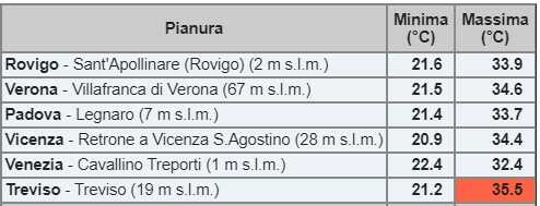 In Veneto, la città che ha registrato quest’oggi la temperatura più alta è stata Treviso con 35,5°.