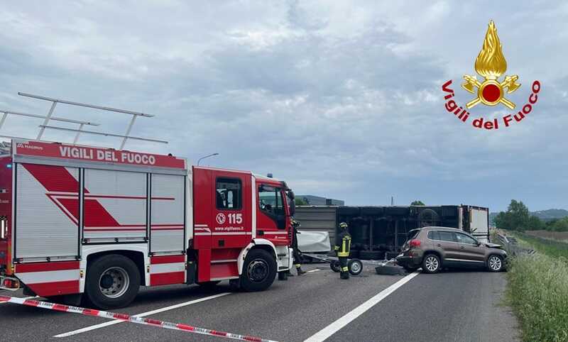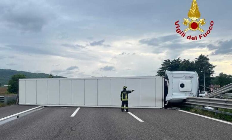 Poco dopo le 17:00, tra gli svincoli di Montecchio Maggiore e Vicenza Ovest per un autoarticolato finito rovesciato, di traverso sulla carreggiata, dopo essere entrato in collisione con un’auto.
