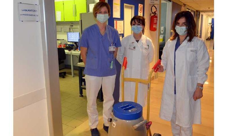 Il trasporto fino in Francia è stato fatto utilizzando un dry-shipper, contenitore che garantisce una temperatura di -199°, costantemente controllata da un coperchio, dotato di registratore di temperatura.