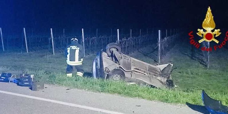 A causa del violento urto, una vettura ha terminato la sua corsa capovolta in un fossato a lato strada.
