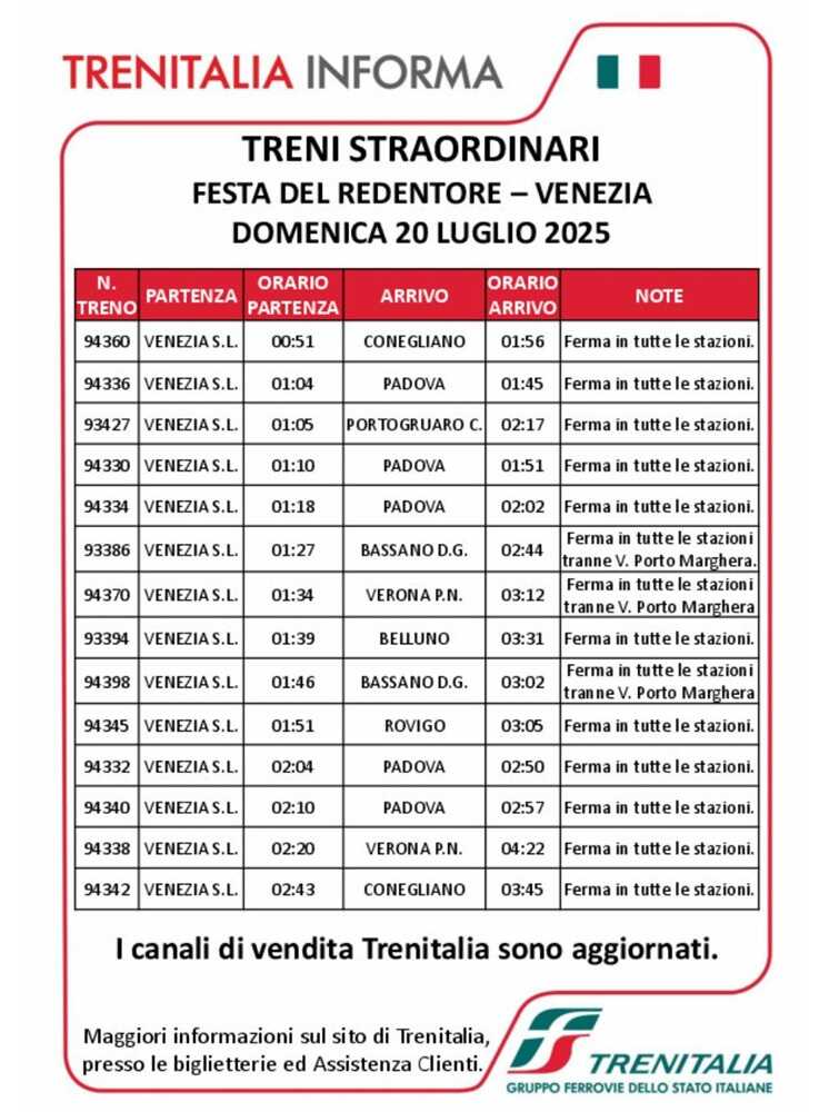 Saranno oltre 16 mila i posti sui treni speciali del Regionale di Trenitalia previsti in partenza dalla stazione di Venezia Santa Lucia al termine della Festa del Redentore.