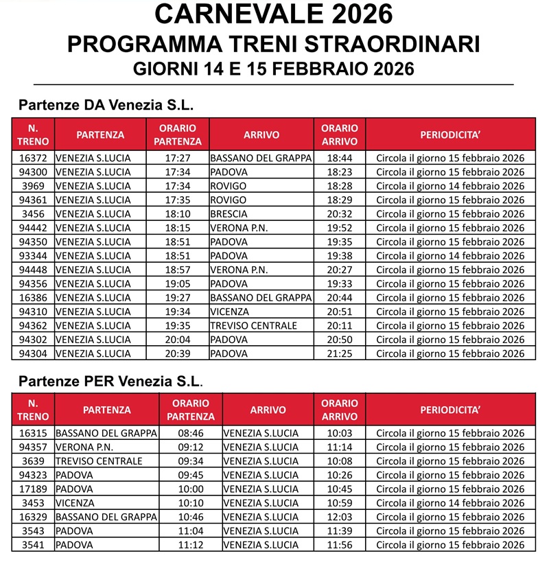 Regionale di Trenitalia, in accordo con Regione del Veneto, ha previsto treni straordinari da e per Venezia per consentire un più agevole afflusso e deflusso dei viaggiatori durante il weekend del 14/15 febbraio.