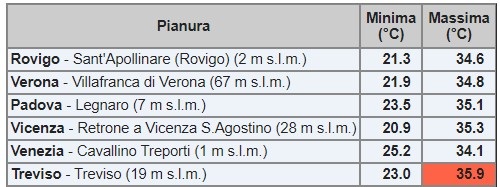 Secondo i rilevamenti dell’Arpav, il capoluogo di pianura che ha rilavato la temperatura più elevata, è stato Treviso.