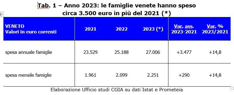 A causa del boom dell’inflazione registrato tra il 2021-2023, pari al +14,5%, la famiglia media veneta ha speso in questi ultimi due anni 3.477 euro in più.