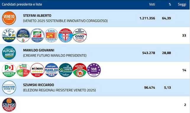 Il Veneto registra un quadro elettorale chiaro e omogeneo al termine dello scrutinio. I dati confermano la forte affermazione della coalizione di centro-destra guidata da Alberto Stefani, in vantaggio in tutti i comuni del Veneto, ad eccezione dei comuni di Venezia (in testa Manildo) e Santa Lucia di Piave (Szumski).