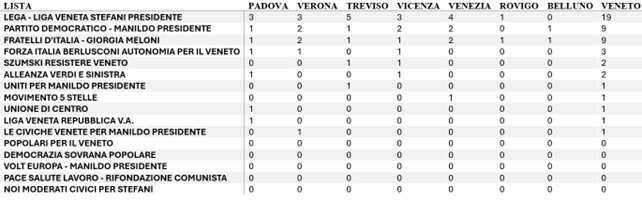 • Lega – Liga Veneto – Stefani Presidente: 19 seggi