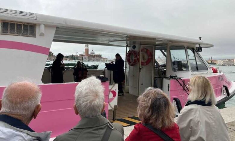Per l’occasione, il Teatro La Fenice ha portato a bordo del vaporetto la propria musica, grazie a una raffinata formazione cameristica tutta al femminile, composta dalle flautiste Claudia Piga e Margherita Russo, e dalla violoncellista Margherita Curti.