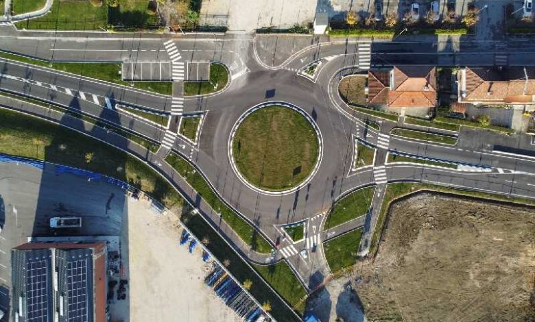 La rotatoria, a 5 braccia, ha un diametro esterno di 40 metri, mentre l’isola circolare centrale ha un raggio di 12 metri.