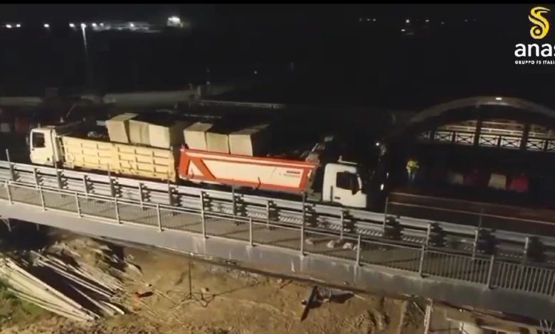 Nella notte tra lunedì 6 e martedì 7 novembre è stato eseguito il collaudo statico del ponte – costituito da 4 campate la cui struttura originaria è risalente al 1963 – condotto mediante l’ausilio di 4 mezzi d’opera, ciascuno dal peso di 56 tonnellate.