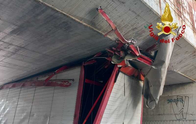 L’autista, che è rimasto illeso, ha calcolato male le misure, rimanendo bloccato con la parte alta del cassone sotto la volta del tunnel.